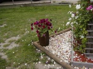 This is an old nail keg with petunias sitting on top