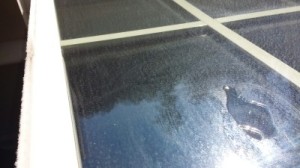 We have lived in our new home about 15 months, sprinkler system was installed about 12 months ago; however, only one window has hard water build up, but both were sprayed with the water. I've tried every thing I've read about and so far, nothing has helped the one window...even left LCR (Lime Calcium Rust) gel to sit for one hour.