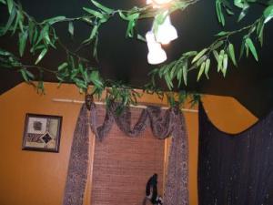 Use a black netting for canopy. You can hang palm leaf garland across the ceiling like I did in my safari room.