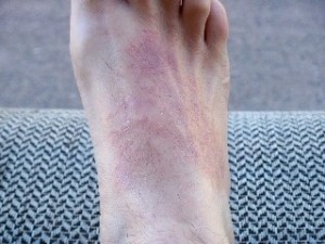 I have a red rash on top of my foot that is made up of 4 lines approximately 1 cm in width that turn circular to my toes.