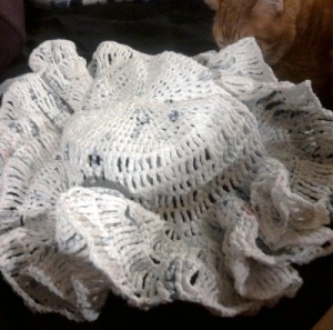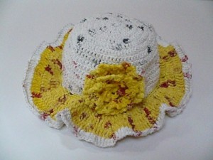 - *Sew the flower in to the hat using sack needle and plarn as thread.