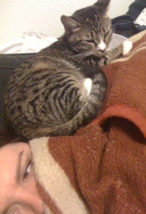 Thanks guys. Oh and by the way, I don't know why but for some reason I wrote that she was born in April - actually meant to say January lol At least that's what we think she was born. And, also don't know what, but for some reason the picture was cropped, but in one of those pics she's sitting on my head :P another one of her favorite pass times. I'm just her pillow.
