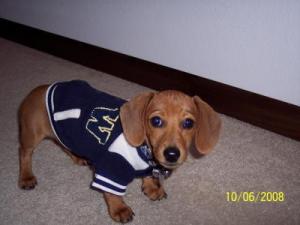 Your puppy is so so so so cute! You better not leave your puppy outside you won't find him after a while. Just kidding.I have a dog too her name is Venus she is a miniature Dachshund too, except she is black, brown, and white she is a female.