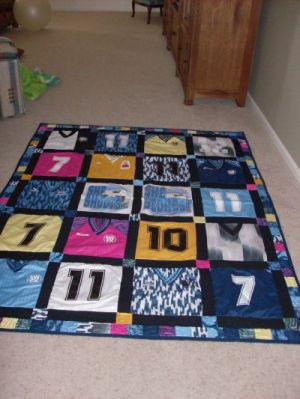 I would love to make a jersey quit. i am re doing my room and I haven't found a bed spread that I like. I think a jersey quilt is the perfect idea! Do you have any pictures? I would love to see what one would look like.