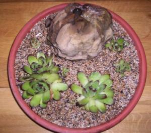 This is what I have done with the saucer from an old plastic post. When I finished planting my hens and chicks I covered the dirt with a light layer of fish aquarium sand.