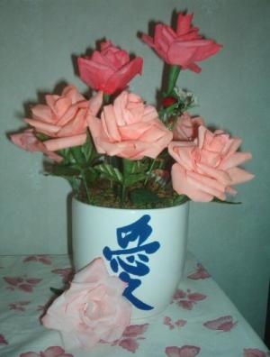 I made also double petal-flowers out of coffee filters.Trace some petals and leaves on the coffee filter ,attach the petals one by one into a bamboo sticks or wire and leaves with a flower tape.Color the petals with your fav color (water color) and green on the leaves.Let them dry and roll the petals outward with the use of pencil or stick and the result are beautifull paper roses.