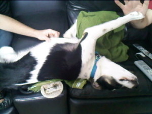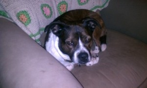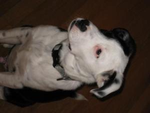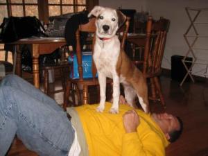 Here's "Maggie" our Boxer/Austrailian mix. Greatest dog ever! Loves to cuddle, sleep on her back, intelligent and has the absoulute softest fur ever!