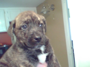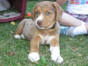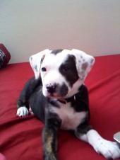 This is a picture of Arizona the day we got her at 8 weeks old. She has all the traits of the Aussie I was attracted to, but I love the boxer traits as well. She is extremly trainable & very playful & cuddly. She is great with our kids & other animals.