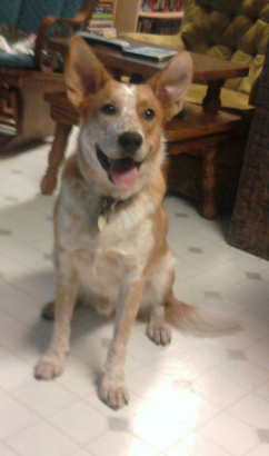 He looks mostly like a cattle dog now that he is older. He has the famous "Bently" mark on his forehead like a cattle dog. He used to have folded down ears, but now one is up like a cattle dog, and one is down like a boxer..sort of! He has very soft short smooth fur all over his body except has wire-y fur on his belly, but its still soft.