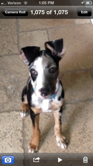 This is our new puppy, Dotti, said to be a blue heeler/boxer mix. She is 15 pounds, 5 months old, so smart and eager to please. I've been looking for info and pictures of similar dogs. This thread has the closest match I have found.