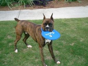 Rocky is a 3 year old Boxer. Rocky was the runt out of a litter of Boxers I had. On the 2nd day after his birth, he died for a few minutes and his mother got his lungs working again. I bottle fed all 9 puppies, but had to feed Rocky about twice as often.
