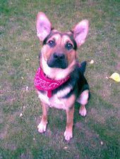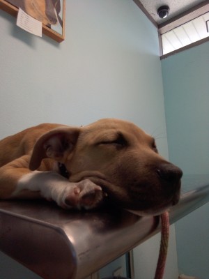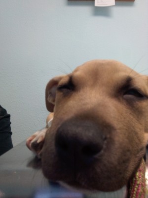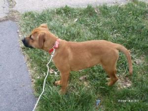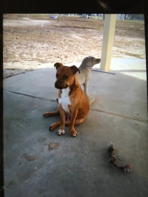 Your dog looks just like my son's dog. I should send u a pic after we get'm developed. Our's is a boxer/red pit mix.