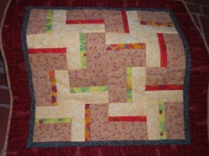 Make your quilt top with squares as Redhatter describes. I usually make my squares about 9". Don't even bother with batting. The 40" x 60" "microfleece" throws that you can get at the drugstore or WalMart are the perfect size for a child. Or sew 2 of them together side by side for a twinbed size quilt. You can also get larger ones at Target or WalMart if you want to make a fullsize or queensize quilt all in one piece.
