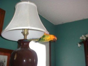 This is our beautiful bird, Juju. We think she is about 5 years old. She is a Sun Conure. Conures come from South and Central America. We got her about 4 years ago as a rescue. Her former owners didn't realize how noisy and demanding conures can be. They also had no idea how to care for her. Her diet consisted of salted sunflower seeds, froot loops, and chex mix and she was never allowed out of her cage.