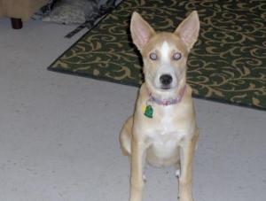Sophie is approx. 3 1/2 years old.  Her breed is a fun guessing game, but we're not sure...the most popular guess is a corgi mix.