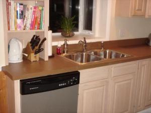 Anyone can do it. Here's a picture before I finished the last section. So you can see the color I previously had. I might mention, my counterops were in good shape when I started this project. The hardest part is applying the poly coats afterwards.