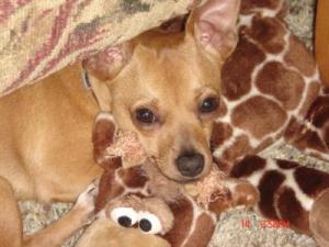 here is a photo of my mini pin chihuahua he is the best dog that i ever had and he loves everyone.