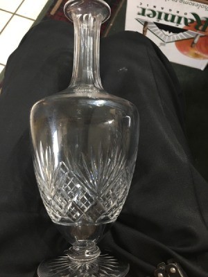 Excellent advise. Thank you so much. Very dark stain 3/4 of decanter. Didn't have liquid dishwasher detergent so I cut the little packet in half and tried to stuff it down the opening. Wouldn't go, so I added warm water. Swish, swish. Deep purple stain completely gone from Waterford decanter. Sigh of relief.