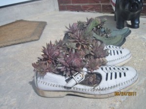 Reuse an old leather shoe as a planter for hen and chicks or other small succulents. This is a great gift idea.