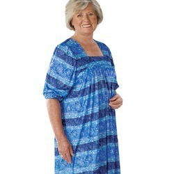 Elastic waists skirts are quick and easy to make. Can anyone sew in your family? Make some for your granny. House dresses are a thing of the past, I'm afraid. I'd suggest a zip front robe/lounger in place of a dress. My mom in in rehab after a stroke and she practically lives in elastic waist pants. They are suitable for wearing while doing physical therapy and they keep the legs warm.