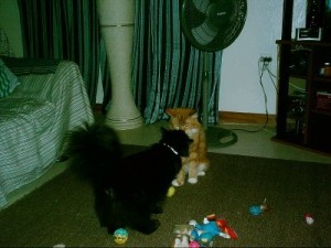 Tigger likes to play with her 2 brothers, Chance and Little Man, with all the toys, mooch tuna from me, and spat at me when I try to get some blanket in my own bed. She is a big baby, and weighs 13 lbs. I call her my Tigga-butt.