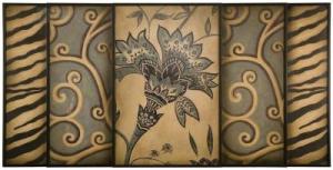 I too have white cabinets with black counter top and appliances I am installing a grey white glass mosaic tile backslash my problem is I have an open concept where the kitchen, living room and dining room are all in one open room I have a mint green sofa, and I am having trouble choosing colors that will coordinate. The art is my inspiration but I don't know if it looks well with green mint.