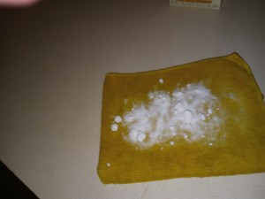 I have a very old white Frigidaire and have tried pretty much everything I could think of to get the grease, grime, and years of wear off of the front. As you can see, I have a yellowish microfiber cloth on which I wet and sprinkled baking soda on.