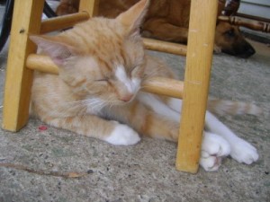 This darling is so adorable. I love the way cats look so happy when they are laying down! Here is a pic of one of our rescues P-Nut when he fell asleep under a bar stool on the patio, look how the German Shepherd, Dutchess, knows what is going on and is sleeping with one eye open.