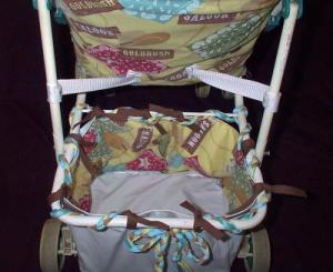 I bought a sturdy stroller at a yard sale for only $2.00! I brought it home to hear my husband say it is the ugliest stroller ever! So I soon made plans to re-cover it. It was a lot easier than I thought. It was basically seam ripping, tracing onto the new fabric, and re-assembling. The only drawback was the color range was limited by the teal plastic accessories. I hope it inspires you!